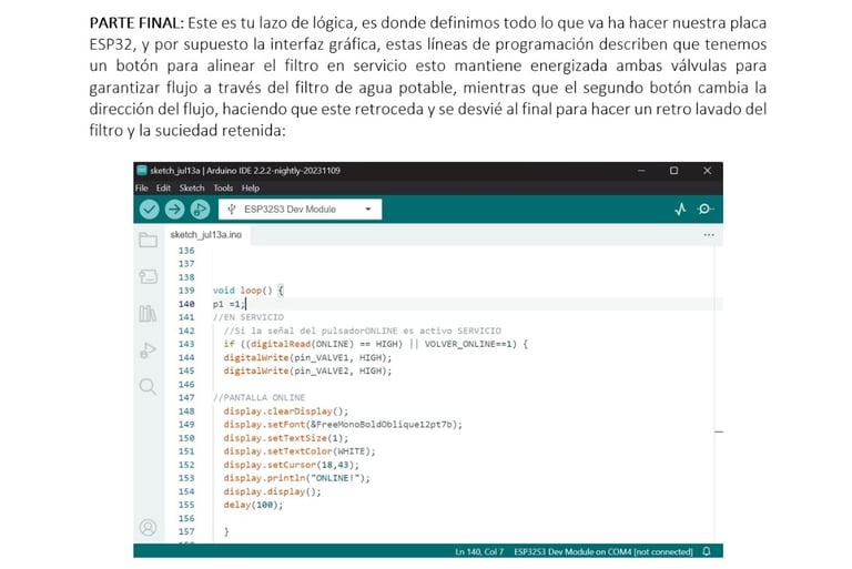 La parte electrónica en realidad es muy sencilla, utilizaremos un display OLED para visualizar el estado del filtro y un par de botones para alinear el filtro y otro para el mantenimiento automático del filtro, como microcontrolador utilizaremos el chip ESP32 que es muy versátil y tiene la cantidad de pines necesarios para el proyecto. Integraremos cuatro RELES para hacer dos puentes H, esto con el fin de cambiar la polaridad de cada válvula motorizada y poder hacer que se de un flujo inverso a través del filtro para retirar toda la suciedad retenida, disminuyendo la frecuencia del mantenimiento.