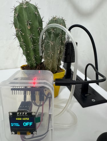 El sistema de riego está basado en un ESP32, el cual se encarga de controlar la activación de una electrobomba o válvula de agua mediante un módulo relé. El ESP32 funciona como el cerebro del sistema, gestionando la conexión WiFi, la comunicación mediante MQTT y la lógica de control del riego. El módulo relé actúa como un interruptor electrónico que permite al ESP32 encender o apagar la bomba de agua sin que la corriente de la bomba pase directamente por la placa. Para ello, el pin de control del relé se conecta a uno de los GPIO digitales del ESP32, permitiendo activar o desactivar el relé mediante el programa. El relé se alimenta con 5V y GND, que pueden provenir del mismo ESP32 o de una fuente externa dependiendo del módulo utilizado. Cuando el ESP32 envía una señal al pin de control, el relé cambia de estado y permite el paso de corriente hacia la electrobomba.
